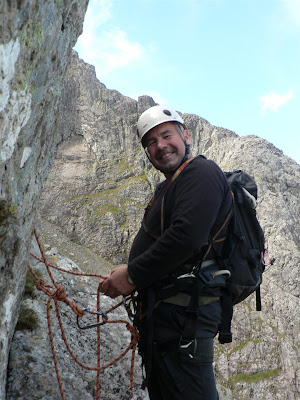 The last belay was from another tiny ledge with the only protection being a sling wrapped round a boulder which have very unlikely to have held any of us in a fall, but when the protection gets sparse you can convince yourself that any protection will hold or at least slow a fall. A psychological boost just to push you on to the next hurdle. I reached a bold looking slab which didn't look really difficult but afforded no protection whatsoever, and after 6 hours of climbing I just didn't have the energy to try it, and therefore scouted scouted around to the left and found the easier climbing. This brought me out onto the final boulder field where I brought up Derek and we both topped out onto the Plateau just below the summit to amazing views across the highlands from the highest point in the UK.